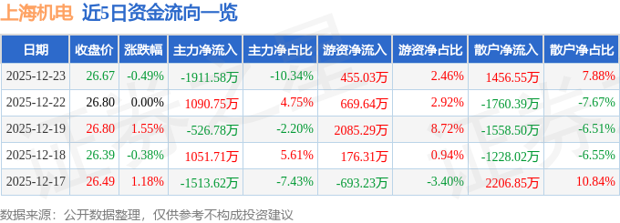 证券之星消息,截至2025年12月23日收盘,上海机电(600835)报收于26.67元,下跌0.49%,换手率0.86%,成交量6.92万手,成交额1.85亿元。