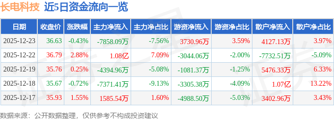 证券之星消息,截至2025年12月23日收盘,长电科技(600584)报收于36.63元,下跌0.43%,换手率1.58%,成交量28.3万手,成交额10.39亿元。