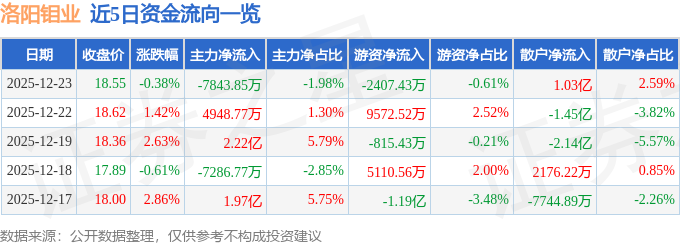 证券之星消息,截至2025年12月23日收盘,洛阳钼业(603993)报收于18.55元,下跌0.38%,换手率1.22%,成交量212.17万手,成交额39.65亿元。