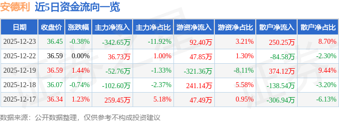 证券之星消息,截至2025年12月23日收盘,安德利(605198)报收于36.45元,下跌0.38%,换手率0.29%,成交量7866.0手,成交额2875.75万元。