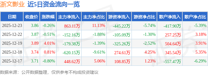 证券之星消息,截至2025年12月23日收盘,浙文影业(601599)报收于3.86元,下跌0.26%,换手率1.73%,成交量20.13万手,成交额7754.31万元。