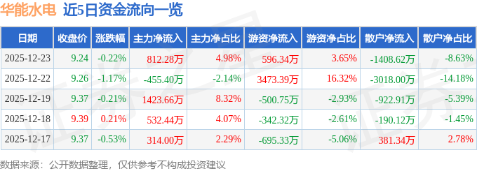证券之星消息,截至2025年12月23日收盘,华能水电(600025)报收于9.24元,下跌0.22%,换手率0.1%,成交量17.63万手,成交额1.63亿元。