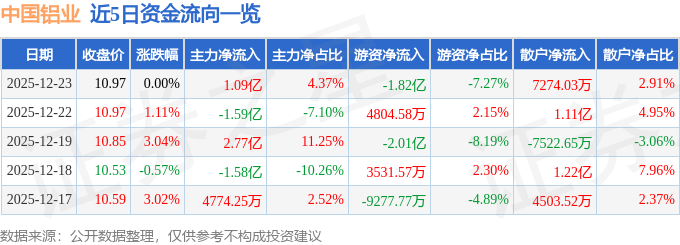 证券之星消息,截至2025年12月23日收盘,中国铝业(601600)报收于10.97元,上涨0.0%,换手率1.72%,成交量226.32万手,成交额25.01亿元。