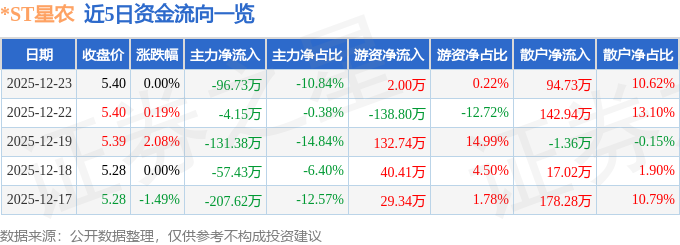 证券之星消息,截至2025年12月23日收盘,*ST星农(603789)报收于5.4元,上涨0.0%,换手率0.64%,成交量1.66万手,成交额892.38万元。