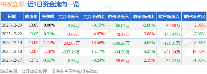 证券之星消息,截至2025年12月23日收盘,中农立华(603970)报收于13.05元,上涨0.0%,换手率0.67%,成交量1.8万手,成交额2355.61万元。