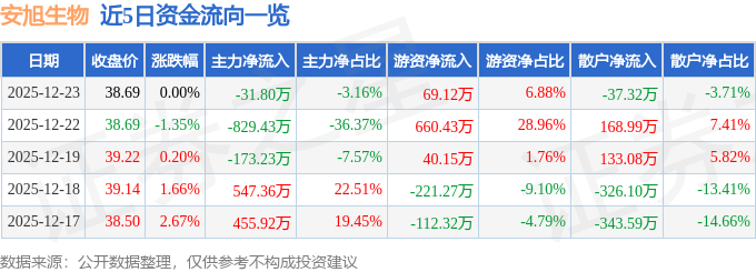 证券之星消息,截至2025年12月23日收盘,安旭生物(688075)报收于38.69元,上涨0.0%,换手率0.2%,成交量2604.0手,成交额1004.95万元。