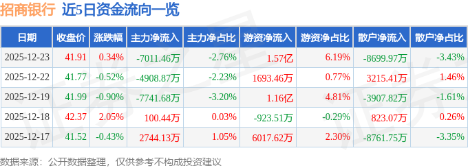 证券之星消息,截至2025年12月23日收盘,招商银行(600036)报收于41.91元,上涨0.34%,换手率0.29%,成交量60.65万手,成交额25.4亿元。