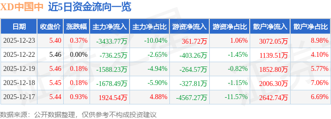证券之星消息,截至2025年12月23日收盘,XD中国中(601390)报收于5.4元,上涨0.37%,换手率0.31%,成交量63.21万手,成交额3.42亿元。