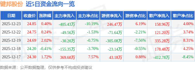 证券之星消息,截至2025年12月23日收盘,键邦股份(603285)报收于24.85元,上涨0.4%,换手率2.58%,成交量1.61万手,成交额3978.68万元。