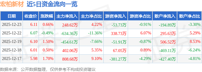 证券之星消息,截至2025年12月23日收盘,宏柏新材(605366)报收于6.11元,上涨0.66%,换手率1.49%,成交量9.7万手,成交额5896.99万元。