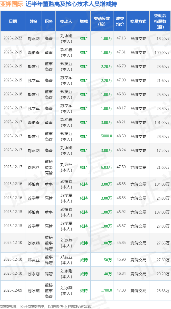 亚钾国际近半年内的董监高及核心技术人员增减持详情如下: