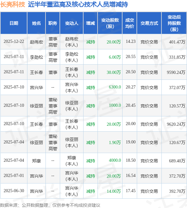 长亮科技近半年内的董监高及核心技术人员增减持详情如下: