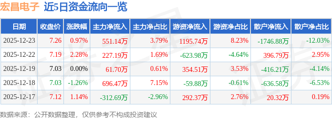 证券之星消息,截至2025年12月23日收盘,宏昌电子(603002)报收于7.26元,上涨0.97%,换手率1.76%,成交量19.97万手,成交额1.45亿元。