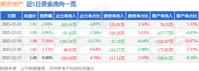证券之星消息,截至2025年12月23日收盘,荣安地产(000517)报收于1.81元,下跌2.69%,换手率1.16%,成交量28.85万手,成交额5273.56万元。