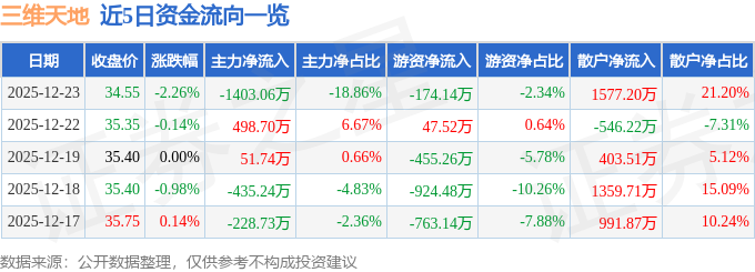 证券之星消息,截至2025年12月23日收盘,三维天地(301159)报收于34.55元,下跌2.26%,换手率4.04%,成交量2.14万手,成交额7438.33万元。