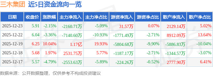 证券之星消息,截至2025年12月23日收盘,三木集团(000632)报收于5.91元,下跌2.15%,换手率15.33%,成交量71.35万手,成交额4.24亿元。