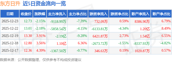 证券之星消息,截至2025年12月23日收盘,东方日升(300118)报收于12.73元,下跌2.15%,换手率10.27%,成交量95.14万手,成交额12.35亿元。