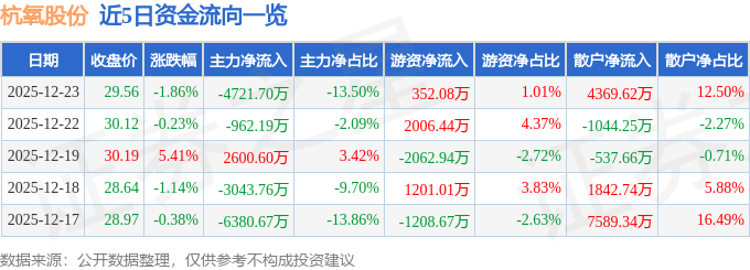 证券之星消息,截至2025年12月23日收盘,杭氧股份(002430)报收于29.56元,下跌1.86%,换手率1.2%,成交量11.72万手,成交额3.5亿元。