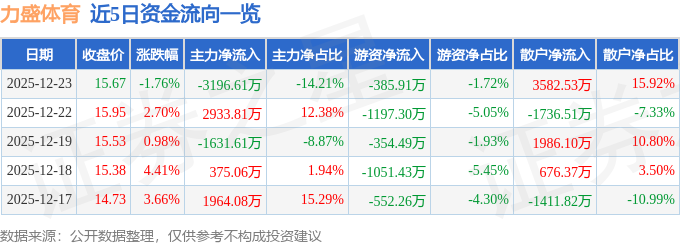 证券之星消息,截至2025年12月23日收盘,力盛体育(002858)报收于15.67元,下跌1.76%,换手率9.6%,成交量14.11万手,成交额2.25亿元。