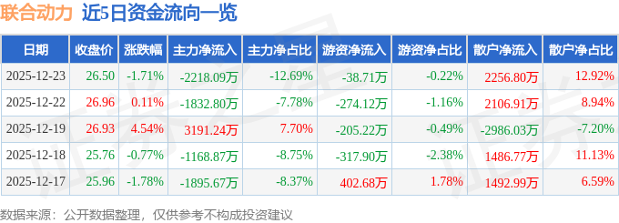 证券之星消息,截至2025年12月23日收盘,联合动力(301656)报收于26.5元,下跌1.71%,换手率3.92%,成交量6.54万手,成交额1.75亿元。