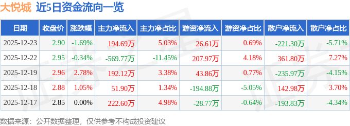 证券之星消息,截至2025年12月23日收盘,大悦城(000031)报收于2.9元,下跌1.69%,换手率0.31%,成交量13.32万手,成交额3873.67万元。