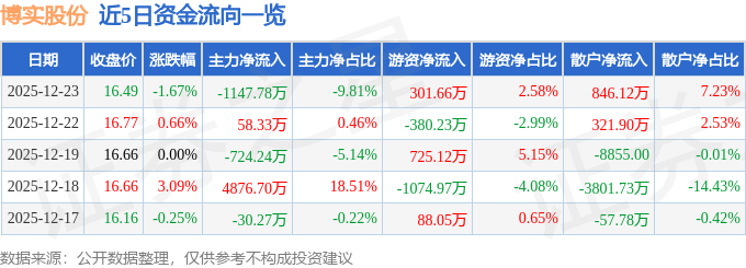 证券之星消息,截至2025年12月23日收盘,博实股份(002698)报收于16.49元,下跌1.67%,换手率0.84%,成交量7.06万手,成交额1.17亿元。