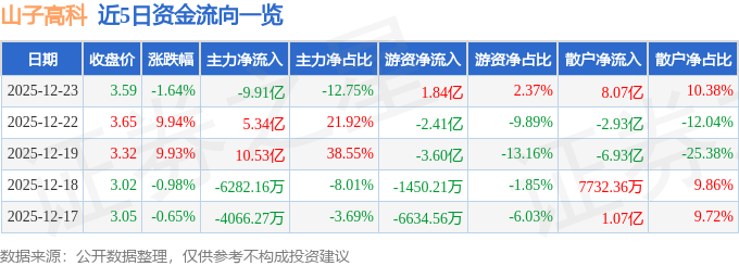 证券之星消息,截至2025年12月23日收盘,山子高科(000981)报收于3.59元,下跌1.64%,换手率21.81%,成交量2075.25万手,成交额77.77亿元。