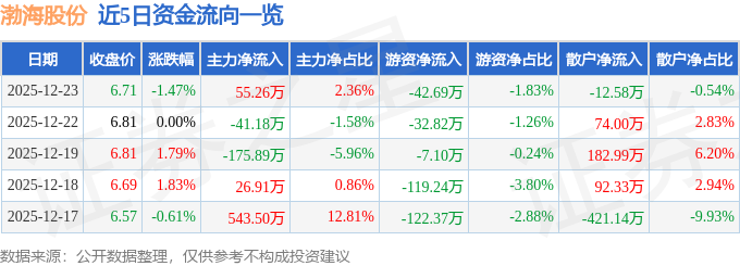 证券之星消息,截至2025年12月23日收盘,渤海股份(000605)报收于6.71元,下跌1.47%,换手率0.98%,成交量3.47万手,成交额2338.45万元。