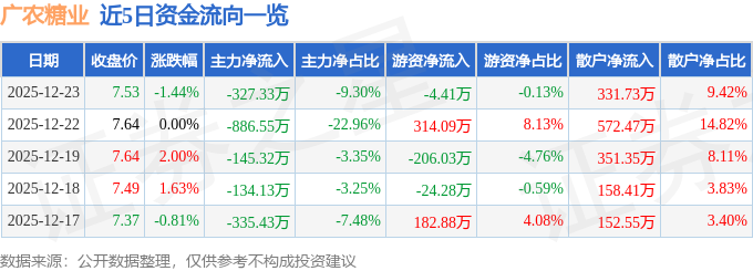 证券之星消息,截至2025年12月23日收盘,广农糖业(000911)报收于7.53元,下跌1.44%,换手率1.16%,成交量4.65万手,成交额3520.36万元。