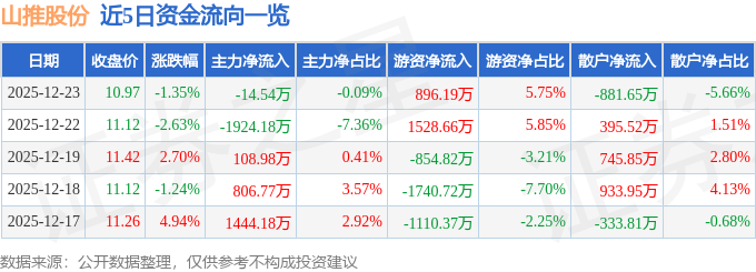 证券之星消息,截至2025年12月23日收盘,山推股份(000680)报收于10.97元,下跌1.35%,换手率1.08%,成交量14.17万手,成交额1.56亿元。