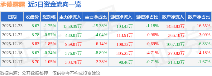 12月23日的资金流向数据方面,主力资金净流出1350.39万元,占总成交额15.38%,游资资金净流出103.43万元,占总成交额1.18%,散户资金净流入1453.83万元,占总成交额16.55%。