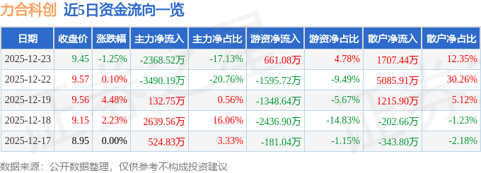 证券之星消息,截至2025年12月23日收盘,力合科创(002243)报收于9.45元,下跌1.25%,换手率1.21%,成交量14.52万手,成交额1.38亿元。