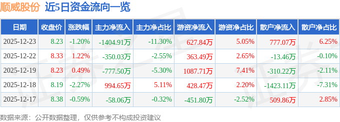 证券之星消息,截至2025年12月23日收盘,顺威股份(002676)报收于8.23元,下跌1.2%,换手率2.09%,成交量15.08万手,成交额1.24亿元。