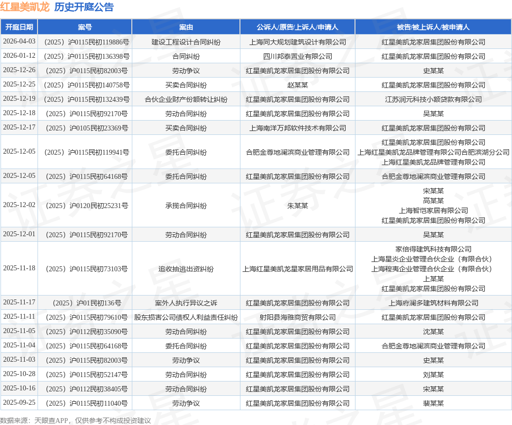 案号:(2025)沪0115民初82003号根据统计,近一年内以红星美凯龙家居集团股份有限公司为当事人的历史开庭公告有69则,其中案由为“劳动合同纠纷”的公告以17则居首,其次为“劳动争议”有11则,“委托合同纠纷”有7则。历史开庭公告(前20条)如下: