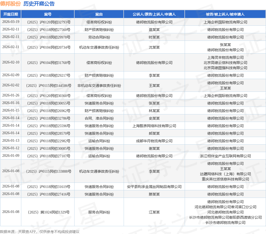 案号:(2025)粤0305民初18150号根据统计,近一年内以德邦物流股份有限公司为当事人的历史开庭公告有385则,其中案由为“快递服务合同纠纷”的公告以112则居首,其次为“运输合同纠纷”有77则,“劳动争议”有29则。历史开庭公告(前20条)如下: