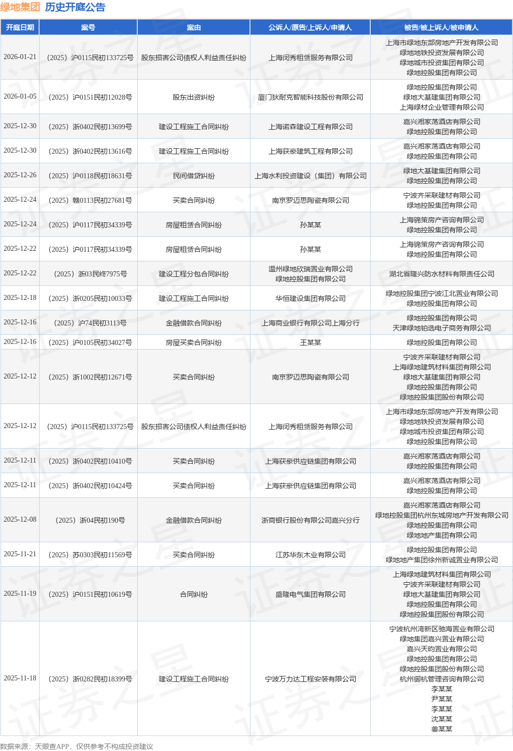 案号:(2025)沪0117民初34339号根据统计,近一年内以绿地控股集团有限公司为当事人的历史开庭公告有203则,其中案由为“建设工程施工合同纠纷”的公告以40则居首,其次为“金融借款合同纠纷”有24则,“合同纠纷”有18则。历史开庭公告(前20条)如下: