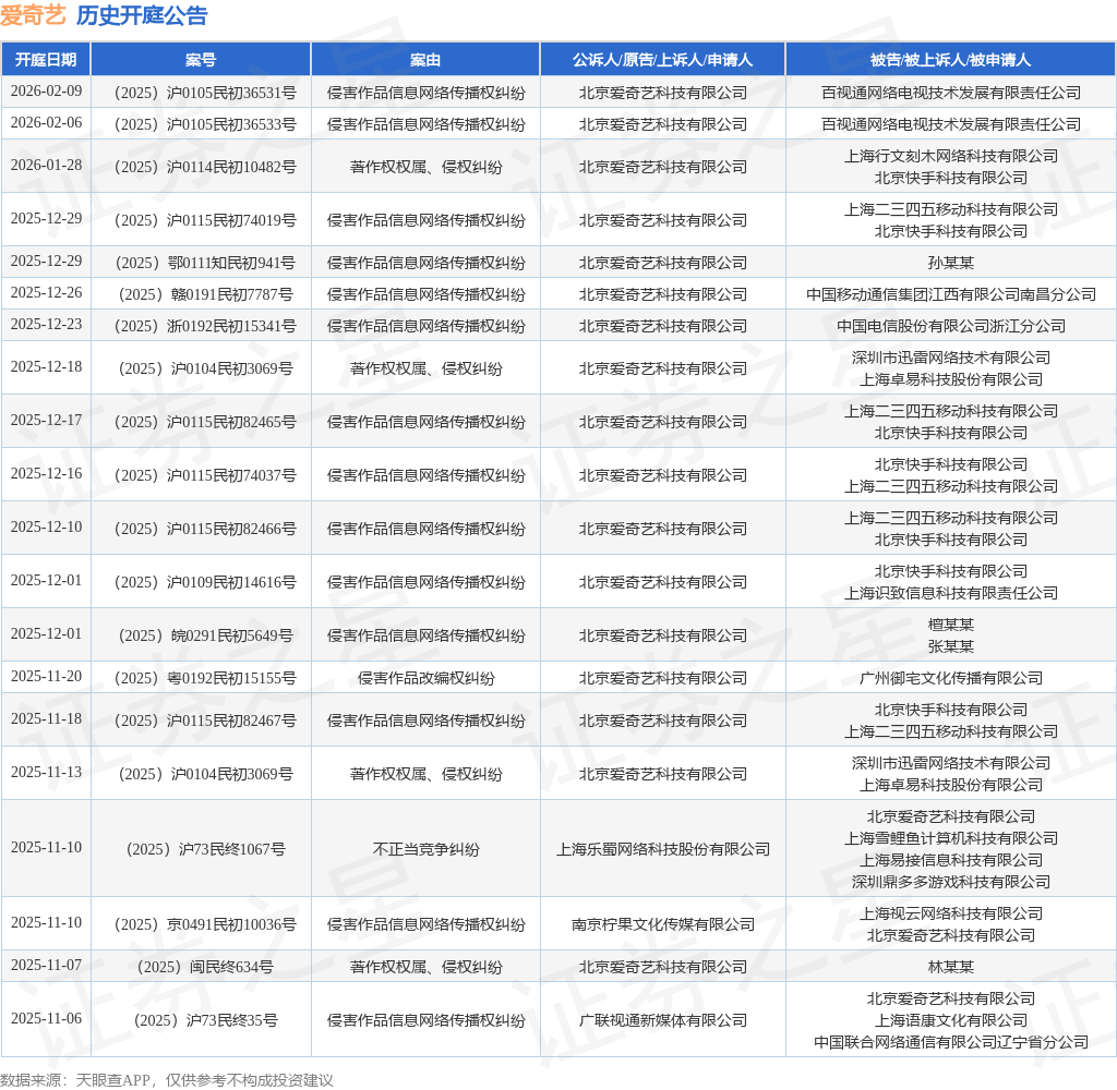 案号:(2025)赣0191民初7787号根据统计,近一年内以北京爱奇艺科技有限公司为当事人的历史开庭公告有300则,其中案由为“侵害作品信息网络传播权纠纷”的公告以228则居首,其次为“著作权权属、侵权纠纷”有17则,“不正当竞争纠纷”有15则。历史开庭公告(前20条)如下: