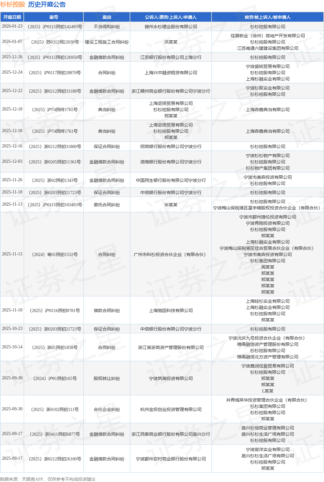 案号:(2025)沪0115民初126950号根据统计,近一年内以杉杉控股有限公司为当事人的历史开庭公告有100则,其中案由为“金融借款合同纠纷”的公告以35则居首,其次为“典当纠纷”有16则,“合同纠纷”有7则。历史开庭公告(前20条)如下: