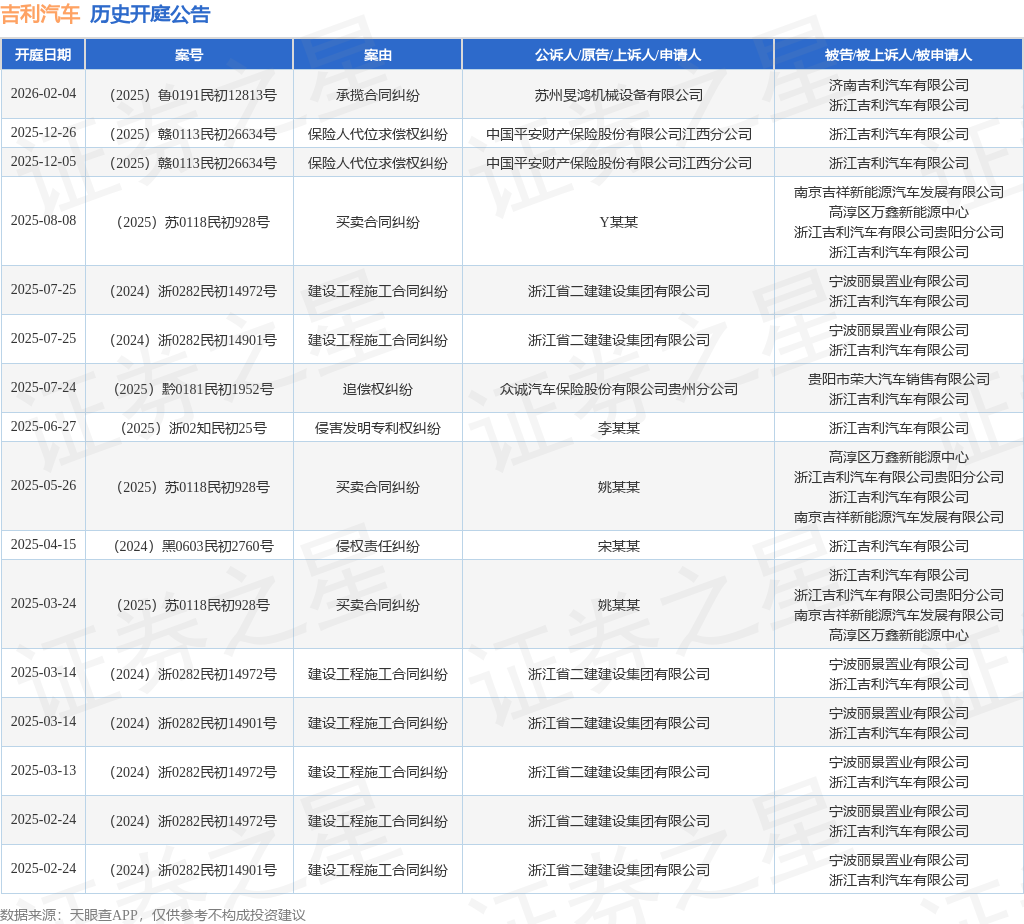 案号:(2025)赣0113民初26634号根据统计,近一年内以浙江吉利汽车有限公司为当事人的历史开庭公告有16则,其中案由为“建设工程施工合同纠纷”的公告以7则居首,其次为“买卖合同纠纷”有3则,“保险人代位求偿权纠纷”有2则。历史开庭公告如下: