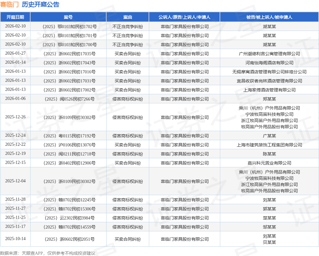 案号:(2025)浙0109民初30302号根据统计,近一年内以喜临门家具股份有限公司为当事人的历史开庭公告有65则,其中案由为“侵害商标权纠纷”的公告以24则居首,其次为“买卖合同纠纷”有18则,“侵害外观设计专利权纠纷”有5则。历史开庭公告(前20条)如下: