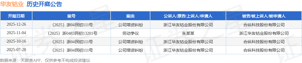 根据统计,近一年内以浙江华友钴业股份有限公司为当事人的历史开庭公告有4则,其中案由为“公司增资纠纷”的公告以3则居首,其次为“劳动争议”有1则。历史开庭公告如下: