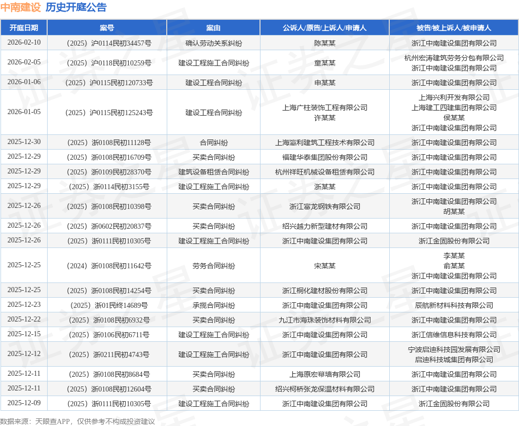 案号:(2025)浙0111民初10305号根据统计,近一年内以浙江中南建设集团有限公司为当事人的历史开庭公告有310则,其中案由为“买卖合同纠纷”的公告以82则居首,其次为“建设工程施工合同纠纷”有62则,“建设工程分包合同纠纷”有41则。历史开庭公告(前20条)如下: