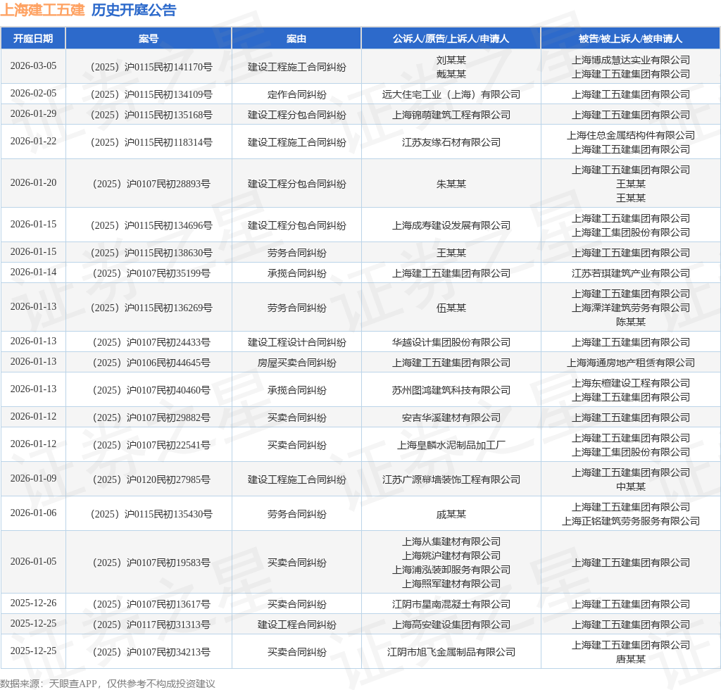 证券之星消息,根据天眼查APP显示,近日公布了一则上海建工五建集团有限公司作为被告/被上诉人的开庭公告,详细内容如下: