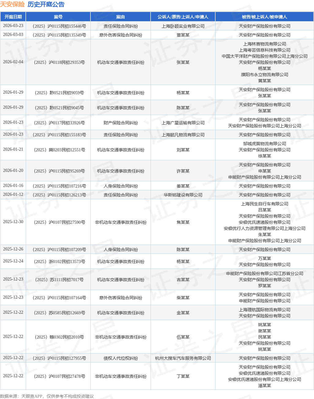 案号:(2025)沪0115民初107209号根据统计,近一年内以天安财产保险股份有限公司为当事人的历史开庭公告有406则,其中案由为“机动车交通事故责任纠纷”的公告以214则居首,其次为“财产保险合同纠纷”有46则,“责任保险合同纠纷”有26则。历史开庭公告(前20条)如下: