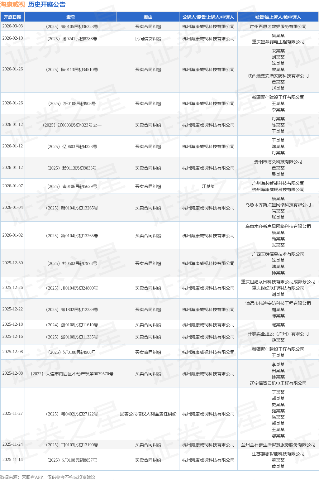 案号:(2025)川0104民初24800号根据统计,近一年内以杭州海康威视科技有限公司为当事人的历史开庭公告有167则,其中案由为“买卖合同纠纷”的公告以132则居首,其次为“债权人撤销权纠纷”有8则,“股东损害公司债权人利益责任纠纷”有8则。历史开庭公告(前20条)如下: