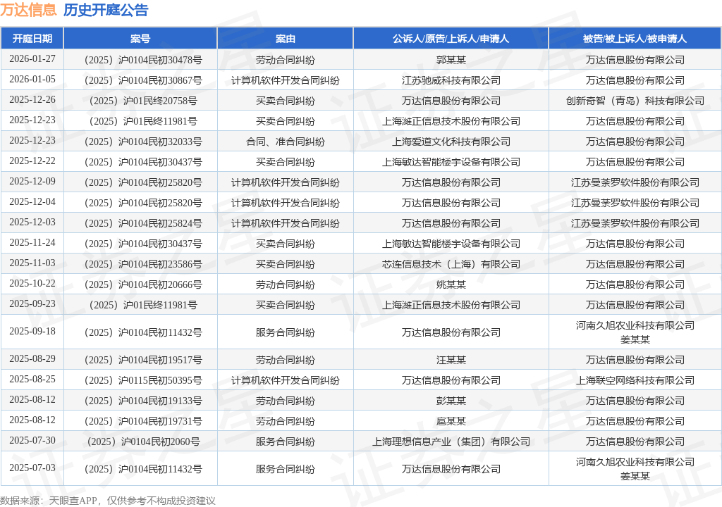 案号:(2025)沪01民终20758号根据统计,近一年内以万达信息股份有限公司为当事人的历史开庭公告有45则,其中案由为“劳动合同纠纷”的公告以12则居首,其次为“计算机软件开发合同纠纷”有12则,“买卖合同纠纷”有10则。历史开庭公告(前20条)如下:
