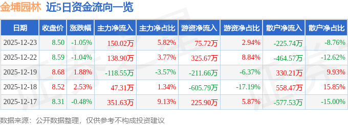 证券之星消息,截至2025年12月23日收盘,金埔园林(301098)报收于8.5元,下跌1.05%,换手率2.02%,成交量3.02万手,成交额2577.16万元。