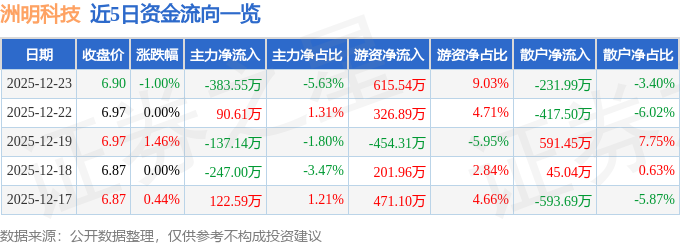 证券之星消息,截至2025年12月23日收盘,洲明科技(300232)报收于6.9元,下跌1.0%,换手率1.11%,成交量9.83万手,成交额6815.48万元。