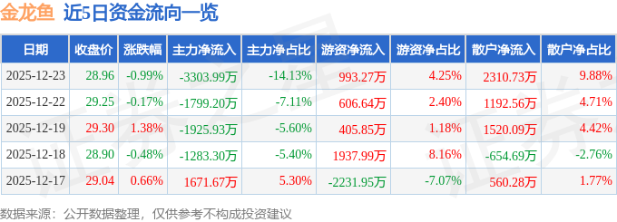证券之星消息,截至2025年12月23日收盘,金龙鱼(300999)报收于28.96元,下跌0.99%,换手率1.48%,成交量8.05万手,成交额2.34亿元。