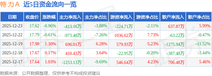 证券之星消息,截至2025年12月23日收盘,特 力A(000025)报收于17.62元,下跌0.96%,换手率1.53%,成交量6.02万手,成交额1.07亿元。